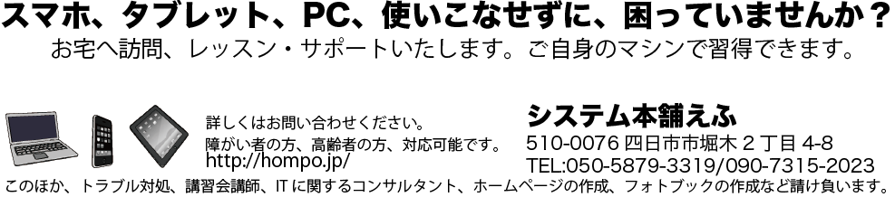 - パソコン、携帯電話、スマートフォン、タブレットの使用方法を、三重県四日市市を中心に訪問指導いたします。